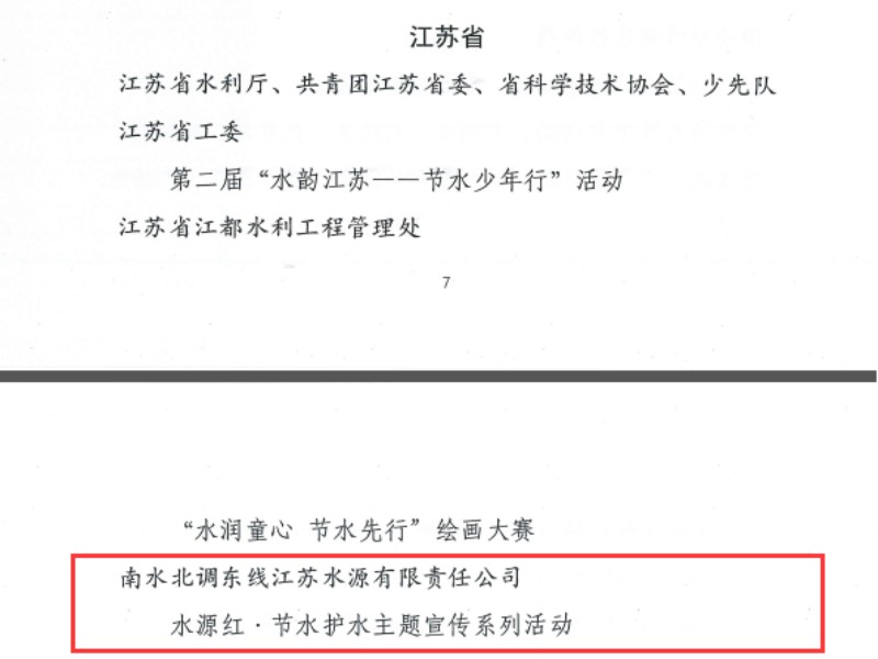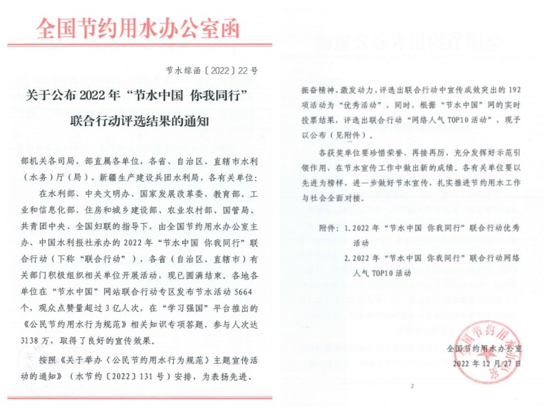 日前,全国节约用水办公室公布2022年“节水中国 你我同行”联合行动评选结果,华体会手机网页版_华体会(中国)江苏水源公司“水源红节水护水主题宣传系列活动”在全国5664个主题活动中脱颖而出,连续两年荣获全国优秀活动。