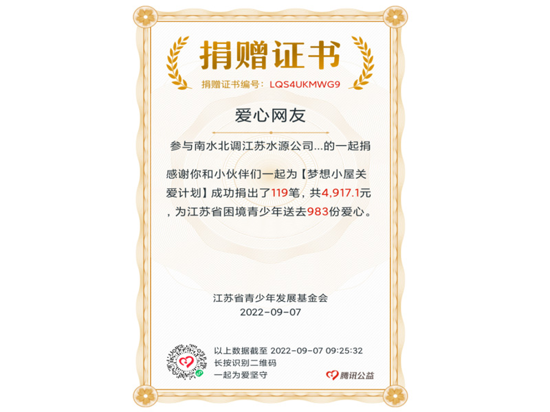 积极践行“我为群众办实事”。组织开展“梦想小屋”江苏省困难青少年筹集爱心捐赠活动,号召公司119人参与捐助,为江苏省困境青少年送去983份爱心。