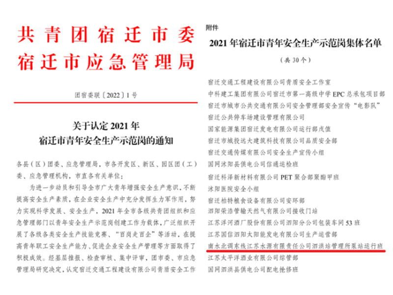 围绕公司主责主业,引导广大青年团员服务好调水运行、涉水经营,冲锋在前、勇挑重担。鼓励青年员工积极参加“五小”创新比赛和技能培训,3年近100名员工获得技能等级认定,有效激励青年员工创新热情。积极引导基层站所和生产经营项目青年员工参与安全生产管理,开展安全隐患排查、安全生产岗位结对等活动,洪泽站管理所获评2022年度省青年安全生产示范岗,泗洪站管理所获获评宿迁市青年安全生产示范岗。