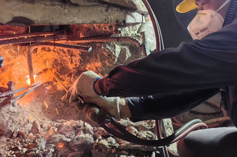 本次作业空间狭小,钢筋交错如织密“铁网”,混凝土坚硬如磐石,安全风险贯穿全过程。为筑牢安全底线,提前划定作业警戒区域,在坑洞处设置醒目警示标识,针对密闭环境,安装排风装置输送新鲜空气,同步部署24V安全照明,将隐患降至最低。为保障项目进度,突击队每日清晨五点便进场作业,在中午近40℃高温厂房内,风镐轰鸣与汗水滴落交织,大家轮班接力,风镐与电钻交替上阵,精准把控每一次凿击力度,历经15天成功将混凝土分段凿除并成功将底环拆除,比预计提前5天完成。短短数日,52个钻头接连磨坏,更印证着这份成果背后的专注与坚韧,用实际行动彰显了专业技术的“硬实力”。