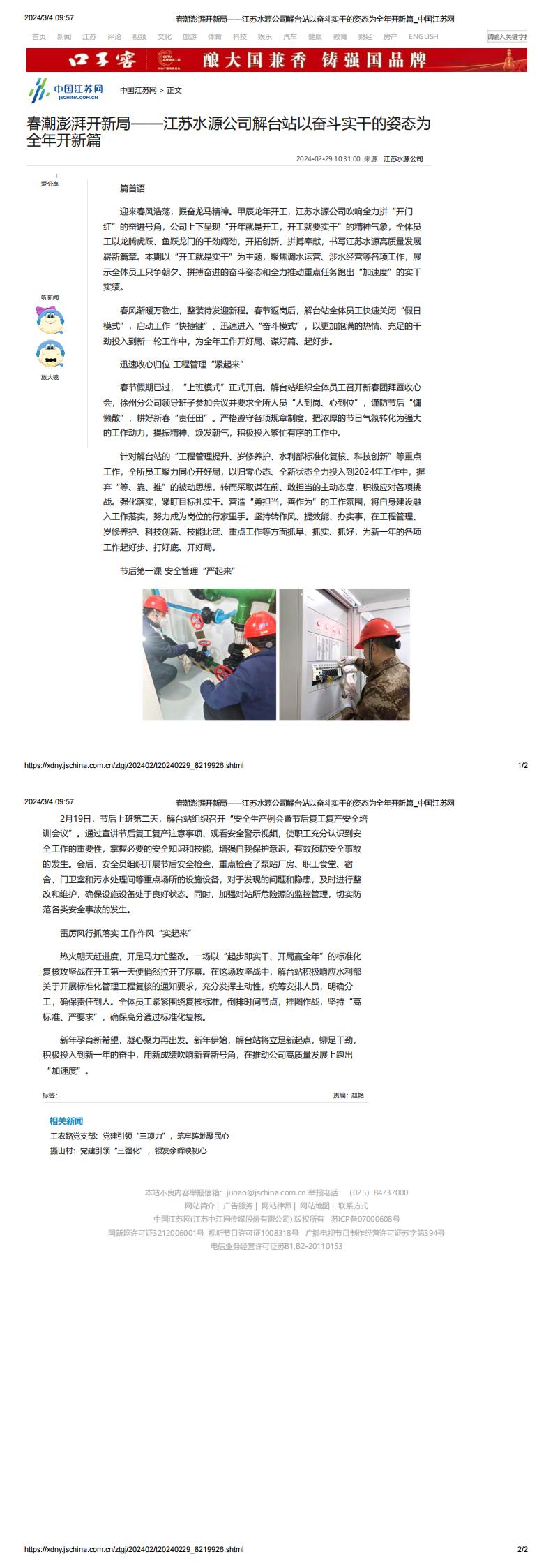 中国江苏网:春潮澎湃开新局——江苏水源公司解台站以奋斗实干的姿态为全年开新篇