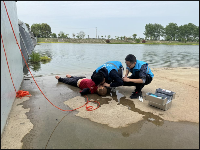 实战演练主要模拟了汛期金湖站排涝运行期间,清污机维修时有人不慎落水的紧急停机和应急救援处置;汛期台风过境,持续降雨导致上游背水坡脚青坎地区域出现渗水、管涌险情后的紧急处置两个典型应急场景。