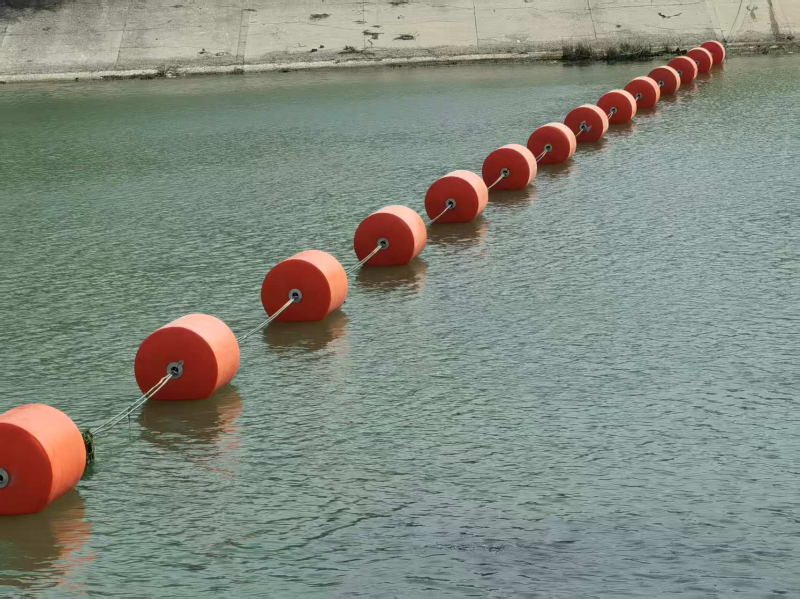 刘山站处于徐州市的主要泄洪通道,汛期泄洪流量大、来水急,并夹杂大量水草杂物,以往每年浮筒式拦河索均遭到破坏,存在较大安全隐患。现场研究设计聚氯乙烯滚筒式浮筒,增加中心旋转和限位装置,当水草到达浮筒时,能够利用惯性顺利自转动的浮筒底部穿过,不会发生水草堆积现象。安装完成后,通过了建站以来最大泄洪瞬时流量780m³/s的考验,上游拦河索未发生水草堆积情况,有效保障了工程安全。