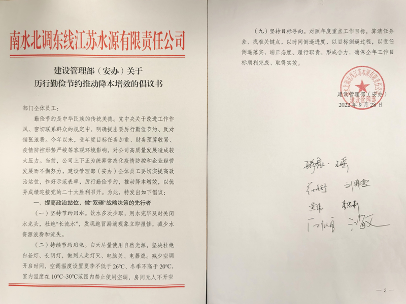 古往今来,勤俭节约体现了中华民族的价值取向和道德风尚。中央经济工作会议强调,要坚持节约优先,实施全面节约战略。今年以来,受年度目标任务加重、财务预算收紧、疫情防控形势严峻等客观环境影响,公司高质量发展面临较大压力。为此,建设管理部(安办)向部门全体员工发出“历行勤俭节约 推动降本增效”倡议,力求以涓滴之力汇聚成助推公司高质量发展、践行全面节约战略的强大力量。