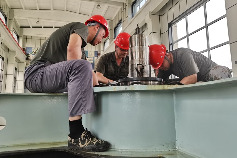入伏以来,气温节节攀升,在持续高温的严峻“烤”验之下,解台站管理所的员工不惧酷暑,毅然坚守在一线。为保障工程安全度汛,解台站利用排涝窗口期,组织技术骨干开展节制闸液压启闭机系统专项检查,针对液压装置电磁阀密封老化导致渗油现象,技术人员头戴安全帽,比对图纸,手持工具,更换相关阀组密封件。雨后的天气格外闷热,汗水顺着脸颊滑落,工作服被反反复复沁湿,他们深感肩上沉甸甸的责任,丝毫没有放缓手上的动作,哪怕高温难耐,也一刻不能耽搁。更换完毕后,他们仔细擦拭着被油污滴溅的每一处地方,并对更换部位进行了仔细的检查,确认保养到位后才长舒一口气,擦擦额头的汗水,开始了另一项检修任务。