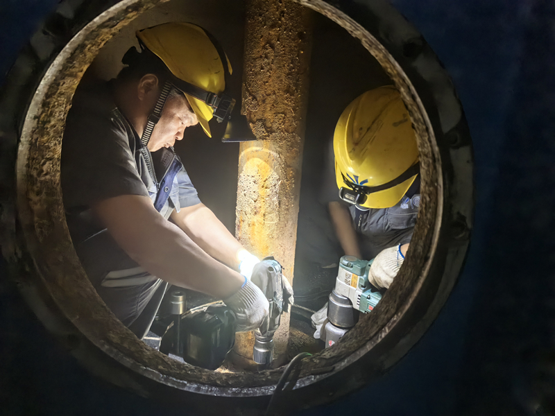 此次检修时间紧、任务重、难度大,高温、潮湿的工作环境,复杂的机组结构,部分关键部件的拆解超出预期,让拆解和维修工作变得异常艰难,带来了极大的挑战;经过现场团队深入研究和反复试验,提出了具体的拆解方案和制作了相应的拆解工装,成功解决了问题,切实提高了工作效率。在拆卸机组主轴时,由于主轴与叶轮之间的连接非常紧密,1#、4#主轴和叶轮属于承插式连接、连接螺母需要从下而上拆除、内部空间狭小,常规扳手拆除困难、效率低,经过多次尝试和研究,采用了特殊的专用工具和方法,最终成功将主轴拆卸下来。