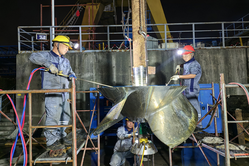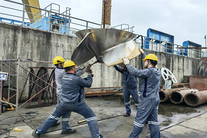 积极运用智慧手段攻克技术难题,缩短大修工期,提升大修质量。在检修过程中,由于钢闸门门槽损坏导致漏水量较大、流道排水缓慢等问题,严重影响了检修进度与质量。为彻底解决这一难题,现场团队根据实际需要,研究定制一套智慧水位控制柜,实时监测水位变化并维持水位稳定,实现了6台潜水泵的远程启停,有效解决了水位控制难题。为了加速排水进程,保证项目进度不受影响,现场团队分工明确,各司其职,检查设备的磨损情况,安装联轴器,细致的调整参数,经过三日三夜的不懈努力与无间协作,最终成功完成流道排水任务,为机组解体清除了关键阻碍。
