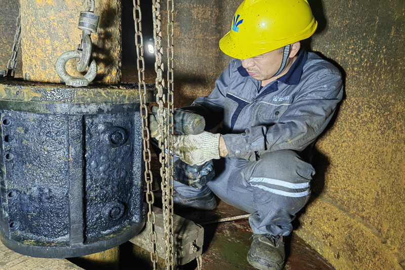 在施工过程中,闸门漏水,影响工期进度。面对这一棘手问题,机械维检团队迅速出动、快速反应,在严寒天气下,连续16个小时配合潜水员做好工具和材料传递工作,保证了堵漏作业的连贯性,最终成功完成闸门封堵工作,为机组解体创造了必要条件;由于设备20年未曾拆解,加上恶劣环境的侵蚀,螺栓早已锈死,与设备紧紧“咬合”在一起,为保障检修进度不受影响,机械维检团队成员主动放弃休息时间、加班加点,采用逐个手动切割拆除的方式,以极大的耐心和精力一个接一个地攻克锈死的螺栓,顺利排除后续部件拆解工作的阻碍,为整个机组检修工作的顺利推进清除了关键障碍。