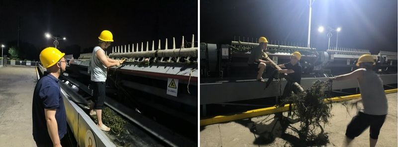 为保障抗旱调水工作顺利进行,带班领导立刻协调检修人员及轮岗人员到达现场紧急处理。检修人员根据现场情况有序开启清污机,利用回旋耙齿将枯树逐步打捞至顶端。